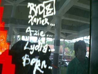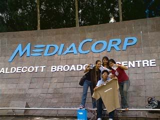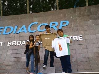 Okie okie...end of scenario. So there we are reaching Mediacorp centre. The place to the reception was somewhat similar to Singapore Custom. Once we step inside, we are amaze at the place. Xavier commented that the toilet there are smelly and it shouldn't be that way. Once lydiana have collected her $100 CD hamper, its time to have fun. On the exit door, there was these pebbles where people leave their footstep behind. So Xavier took a pebble and wrote down all the 5 names and include NYP at the corner of the stone. Then we go check out the vending machine and there was names written on the surface of the machine. So we took out a marker pen and write down our name. Then we also leave our footstep at the marble seat. So we did leave alot of footprint behind. Next, we take a picture of us posing infront of mediacorp sign together with the hamper items.